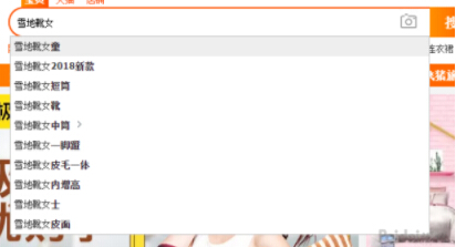 去淘宝首页的搜索框里面搜索出雪地靴女的下拉关键词。
