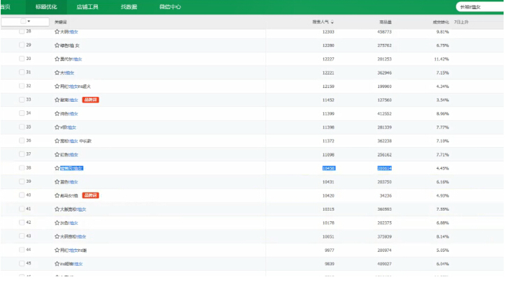 1·上架产品,首先我们得为我们的单品做前期准备,标题得做好,根据店铺层级,每个层级有对应的免费搜索流量的极限,低层级的店铺前期不做大词,选取长尾词,根据搜索人气、搜索热度、在线商品数评判,前期新品选取中等人气,在线商品数少的词,后期正常推广了,标题是需要优化的,因为前期的词根根本满足不了我们后期的所需要的流量。在就是属性价格,这些都根据你的产品来合理编辑,在就是图片,主图尤为重要(不过我们后面要测试的,让数据说话)详情页==这些都不能马虎。看下图,人家做标题都是根据数据来做的,不是随随便便凑满三十个字就行了。